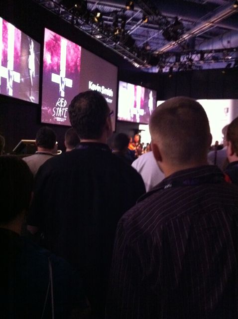 Avid booth in South Hall Upper Floor during a Kevin Smith presentation. Do you see him? He’s that blurry lit head sticking out in the middle left. Booths can be swamped on Monday and Tuesdays, especially during major presentations like this.