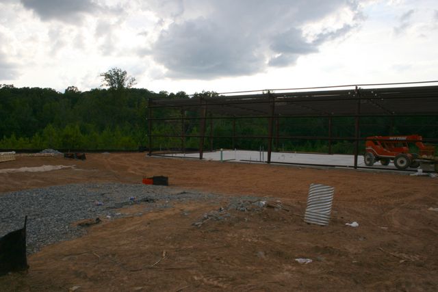 End of the day, looking from the back left corner of the building. Directly in front of me is the space for the oversized garage door. That’s going to give us a drive in door for to make for easy load in of equipment.