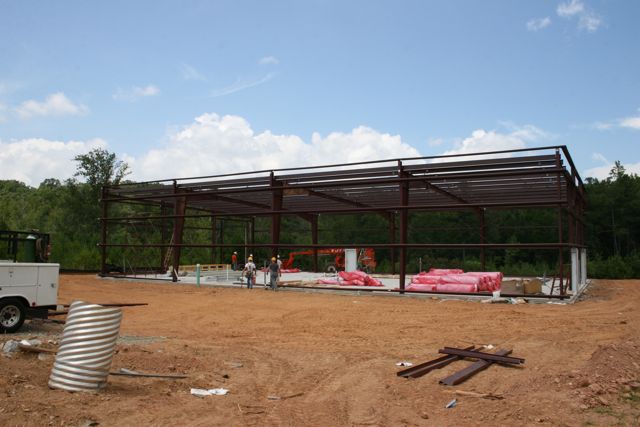 Here’s a two day update and in fact I need to stop by in the morning to get a few more photos of where they ended up today. Storms rolled in tonight and then I had a dinner engagements. But the building is moving along at a steady clip thanks to the guys from Metal Building Associates.