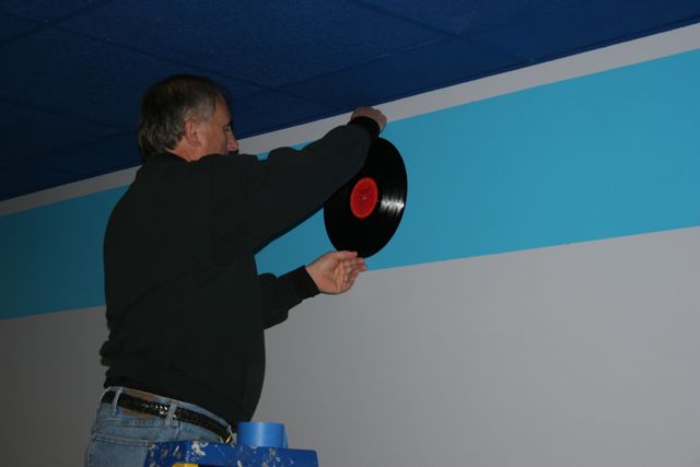 45′s and LP’s from our personal collection. Been years since we’ve listened to them so they’re becoming part of the 50′s / rock n’ roll diner motif. We have a 16″ stripe along the wall to decorate so I used some paper on the floor to lay out the pattern first before we started putting them on the wall.