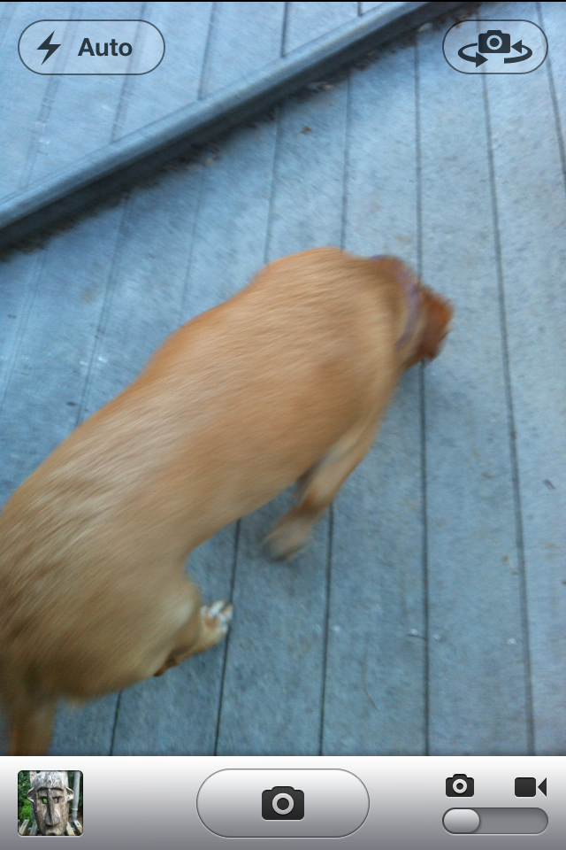 See that little camera twirl in the upper right? Just click that and it switches between the front and rear camera. So now taking shots with your favorite puppy is as easy as trying to get her to sit….
