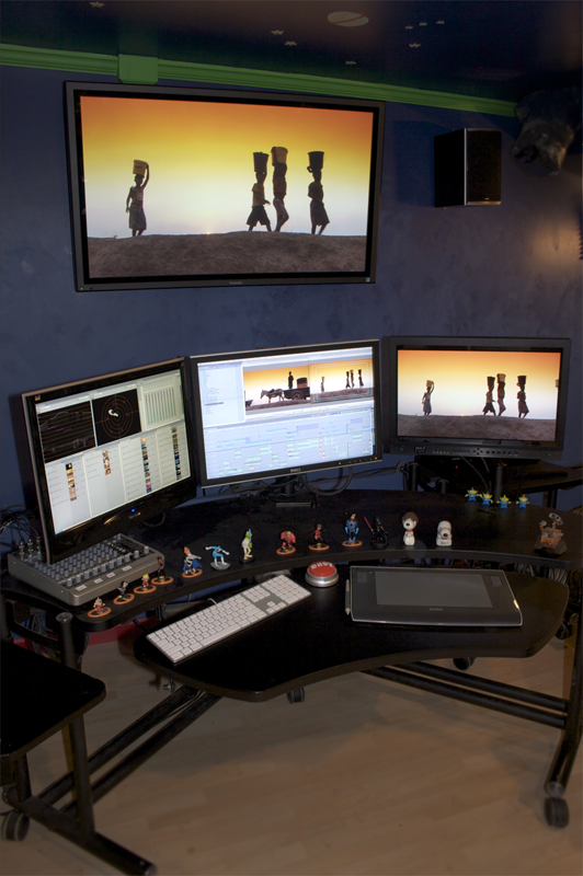 Oh and if you’re wondering where the computer is, it’s in the machine room. We don’t have computers in any of our suites. You would not believe just how quiet the rooms are, it’s the first thing clients notice. No computer, no hard drives, no machine noise. My room is close enough that I have a pair of 35′ DVI cables and a USB extender to go through the wall to the computer. The other two edit suites use Gefen DVI / USB extender boxes that have a Sender unit at the computer and a Receiver unit at the monitors / keyboard with Cat5 cables strung between. The JungleLand suite has 65 foot Cat5 runs and the Rialto suite has 95 foot Cat5 runs so we can put the computers pretty darn far away from the suites.