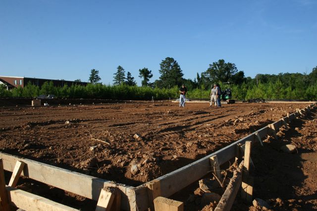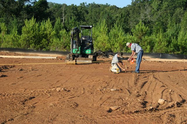 Chuck (standing) and his son mark the location of one of the bathrooms. It’s kind of neat in this age of GPS, computers and all kinds of technology a trusty tape measure, level and some string are all they need to mark the proper locations. No school like old school…..