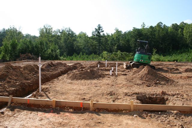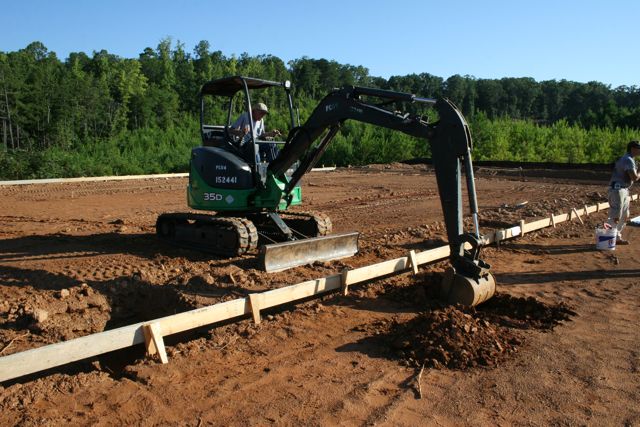 Chuck’s son in the trench getting ready to rough in the pipes. That’s Joe McCabe in the background doing what the general contractor usually does on a job. Talk on the phone while the other folks work. Not really. He was out on the site early this morning working over the layout with Chuck and he’s doing an awesome job overseeing everything.
