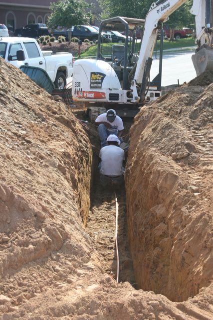 Putting in the water line. I’m amazed at how these guys dig all this out without hitting the buried electrical, gas and existing water lines. And it’s about 92 degrees out too….