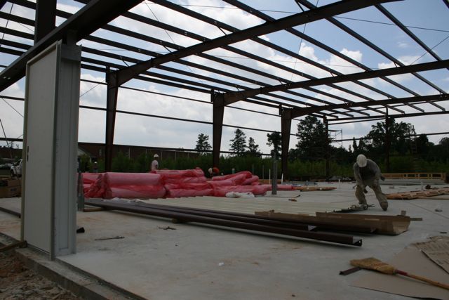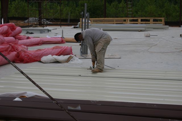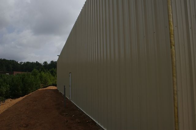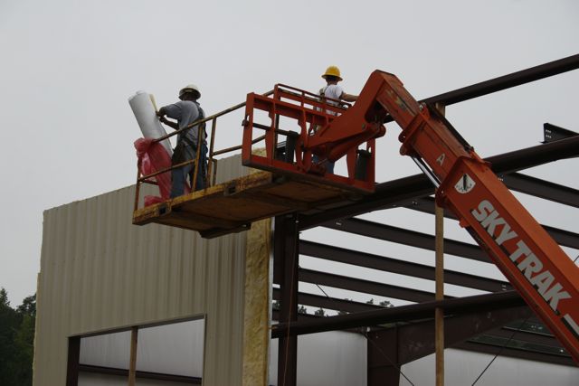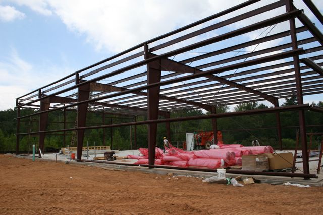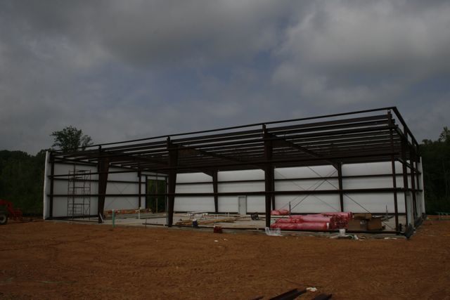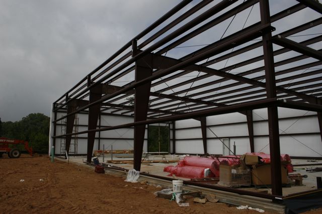 Here’s a two day update and in fact I need to stop by in the morning to get a few more photos of where they ended up today. Storms rolled in tonight and then I had a dinner engagements. But the building is moving along at a steady clip thanks to the guys from Metal Building Associates.