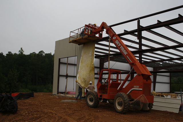Prepping the insulation. Rolled insulation is installed behind the outer skin of the building.