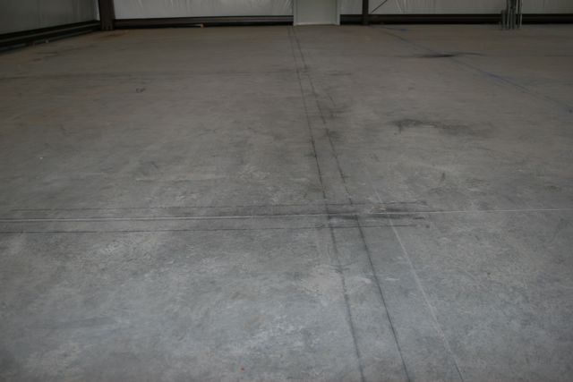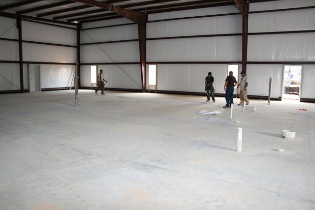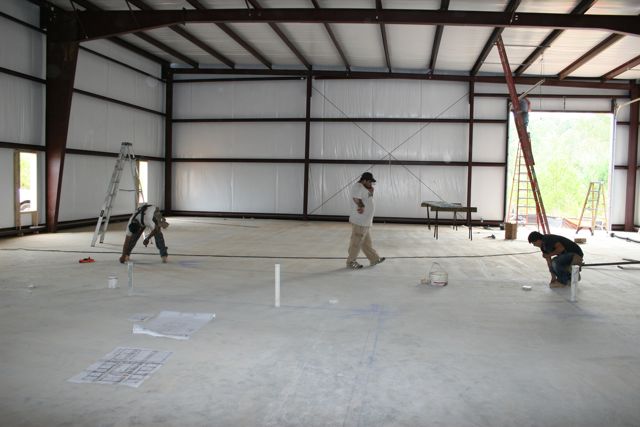 The construction crew runs chalk lines all along the concrete slab to mark the wall locations and being there gave me the chance to visually see for the first time what the walls look like laid out in the building. Here they are marking the unfinished open space, about 1400 square feet of space we can use for a variety of things include an insert stage.