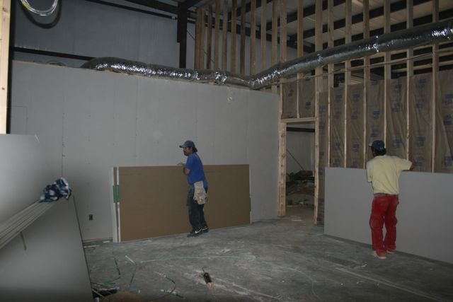 So to recap…. 7am this morning, no drywall on the walls. 7pm tonight, Drywall fully hung on all the 4800 square feet of walls. WOW! These guys are good. I’d be happy to get a single 10 x 10 room done in one day! More tomorrow!