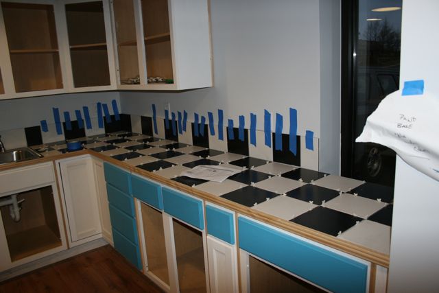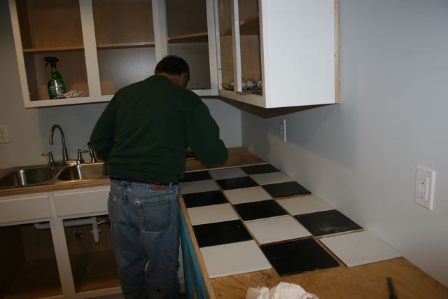 Contractor Joe McCabe laying out the kitchen counter. Incorporating the nice 50′s diner black and white tile pattern.