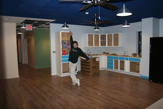 Vanna White (Rebecca) presents the kitchen / gameroom. Cabinets are in place, ceiling is painted, lighting and fans are in, dishwasher is ready for installation and the fridge is in place.