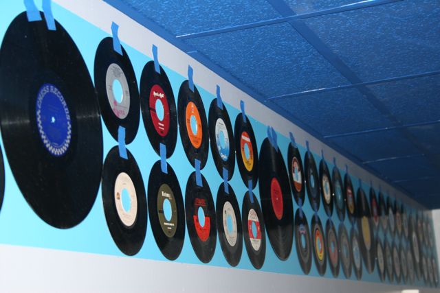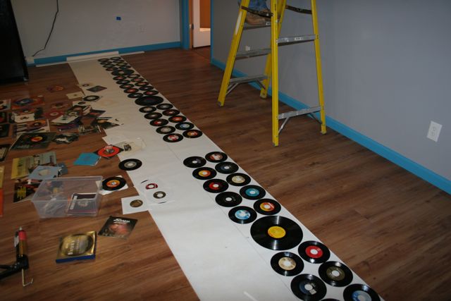 45′s and LP’s from our personal collection. Been years since we’ve listened to them so they’re becoming part of the 50′s / rock n’ roll diner motif. We have a 16″ stripe along the wall to decorate so I used some paper on the floor to lay out the pattern first before we started putting them on the wall.