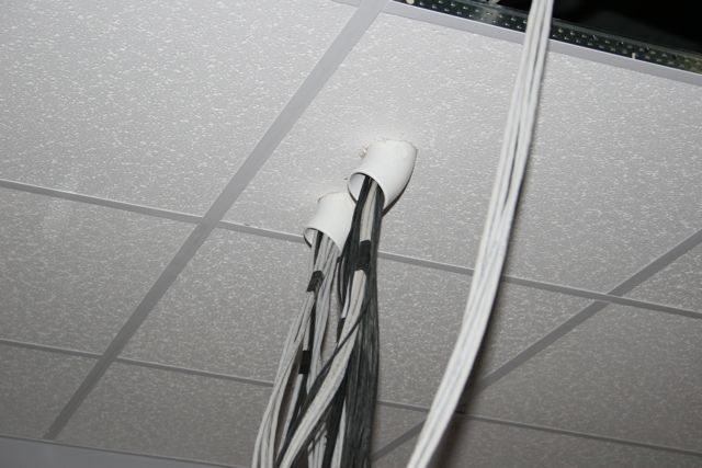 Detail of the cable drop. I like everything to look clean and neat. Those pipes absolutely do the trick. And since we have a drop ceiling, we can switch tiles around if we decide we want to drop them down to the left or right.