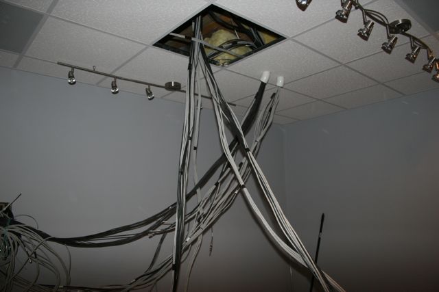 All the main cabling was brought down through the ceiling and into the machine room. All cabling and power will be dropped from the ceiling so there will be zero cables on the floor when we’re said and done. Joe came up with a nice pipe setup to make the drop clean.