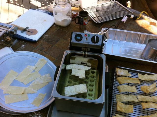 So here’s the setup, you can see I have a hand crank pasta machine partially out of frame on the left, my Waring Pro deep fryer in the middle, cutting board with pizza wheel upper left and the drying rack on the right. You have to roll the dough out pretty much paper thin and the pasta machine is the only way I’ve found to roll it that thin. And all of this is set up outside on our deck to keep the fry smell out of the house. It’s 45 degrees out there, but it’s no problem to with some hot coffee.