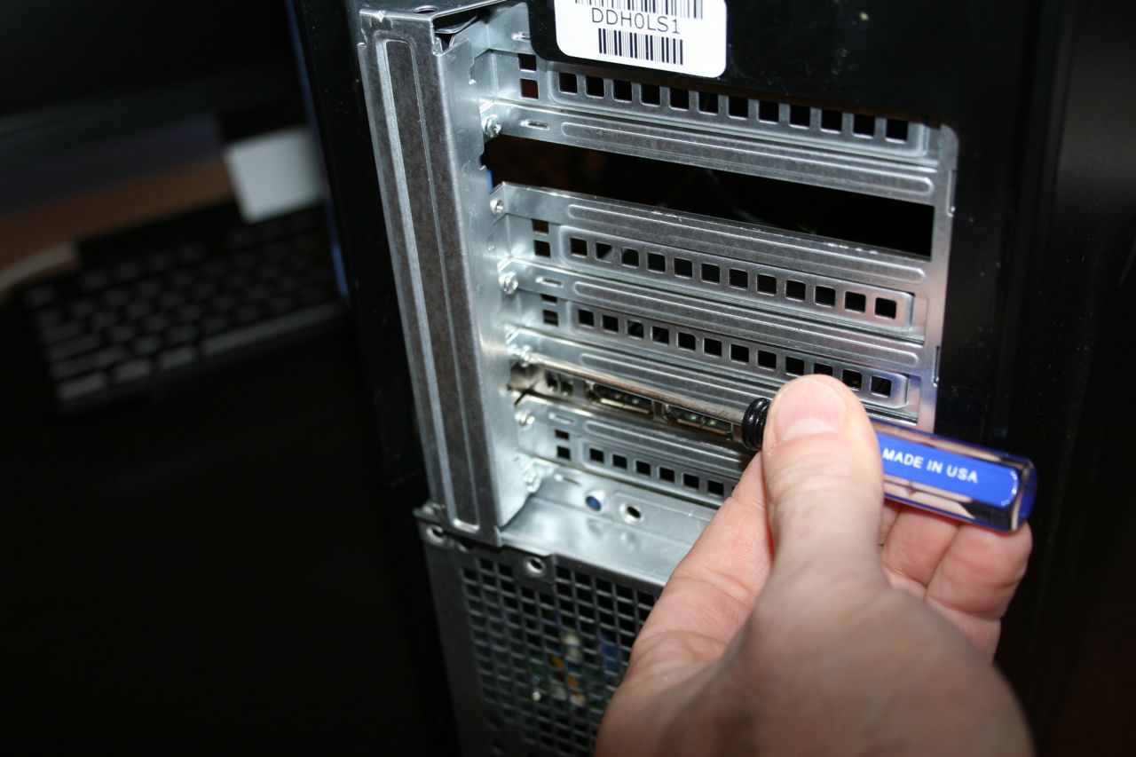 This involved…. go around to the back of the machine to unscrew the PCI slot cover. Yes, this is on the outside back of the machine. I’ve never seen the screws on the outside.