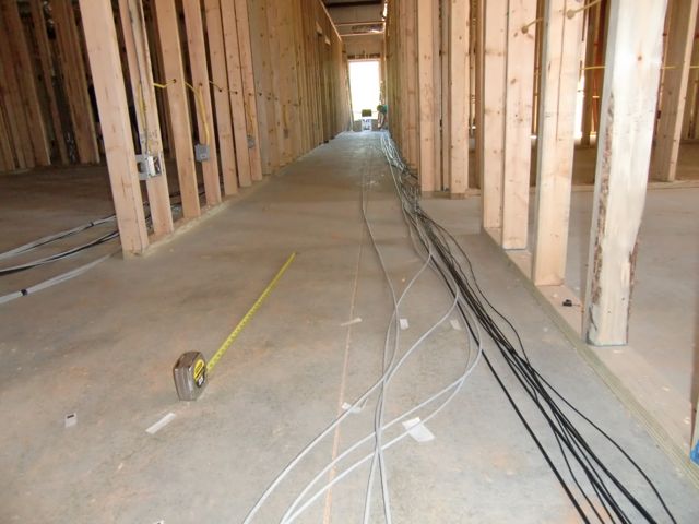 Video, Audio and network cable stretched down the hallway with John manning the boxes at the end of the hall. We used string initially to figure out all the cable runs by simply running the string exactly as we wanted to run the cables, and then just measure the string. Very simple, very low tech and very accurate.