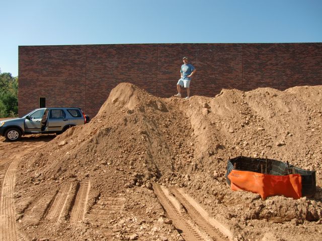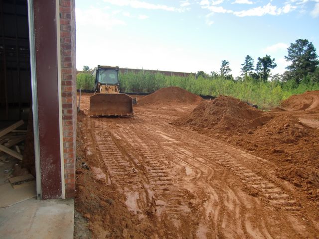 While we were working inside, the front end loader was taking down the dirt outside in preparation for the parking lot.