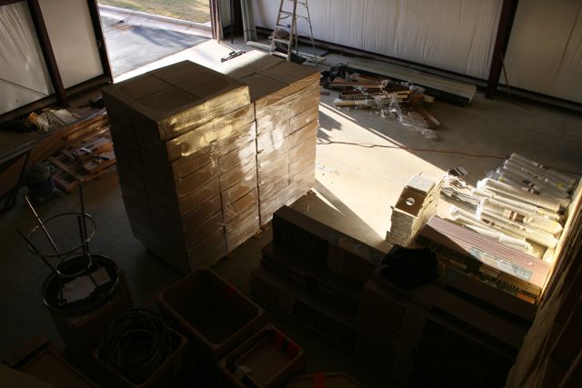The warehouse has turned into a workshop for the ceilings and flooring. That huge stack in the center are the 2 x 2 ceiling tiles and the boxes / rolls to the right are the laminate flooring. It’s nice to actually HAVE a warehouse where we can throw a bunch of stuff and not have it in the way.
