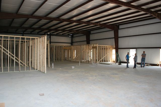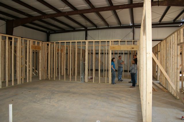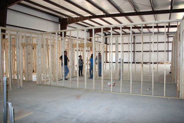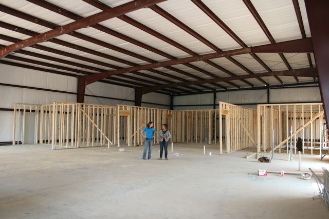 I’m in the conference room looking back across the facility. That’s Adrienne and Jenny standing just outside one of the bathrooms. These clears pan steel buildings are just so versatile giving us endless configurations we can put together inside. The roof is about 19′ off the ground so we can literally make the ceilings as high as we want. We’re going with 10′ ceilings all around with 12′ ceilings in the kitchen and conference room.